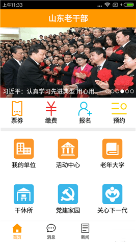 老干部APP客戶端-是專門針對離退休老干部設(shè)計,通過定向推送專屬消息,電影預(yù)約等服務(wù),通過新聞和各單位宣傳模塊來充分展示老干部豐富多彩的生活,也將所有與老干部相關(guān)工作整合到一個信息平臺上,讓老干部通過APP隨時隨地相互了解和相互學(xué)習(xí),真正做到宣傳帶動和引領(lǐng)示范