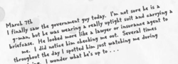 今天我終于見(jiàn)到了那個(gè)來(lái)自政府的人。我不肯定他是一個(gè)政府官員,但他穿著一套相當(dāng)拘謹(jǐn)?shù)囊路€攜帶著一個(gè)公事包。在我看來(lái)他更像一個(gè)律師或是一個(gè)保驗(yàn)經(jīng)紀(jì)。我注意到他打量著我。這天有好幾次在訓(xùn)練的時(shí)候,我都發(fā)現(xiàn)他恰好觀察著我。我很疑惑他到底想怎么樣……