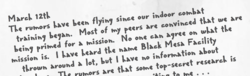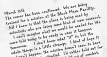 那項(xiàng)謠言已經(jīng)得到確認(rèn)。我們的訓(xùn)練是為了在一個(gè)叫做黑山基地的科研基地進(jìn)行的任務(wù)而設(shè)。我唯一知道的是那個(gè)地方是被一些科學(xué)家用作某種新型的研究。我不能想像我們需要些什么。今天我們被告知我們要準(zhǔn)備好,并設(shè)想它將在明天發(fā)生。我不知道“它”是什么,但整件事情有點(diǎn)奇怪。這令我感到不安,我希望它不要發(fā)生;那項(xiàng)任務(wù)看來(lái)沒(méi)有任何潛在且令人興奮的因素。我頗期待某些更有可能發(fā)生戰(zhàn)斗的東西。