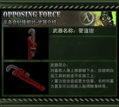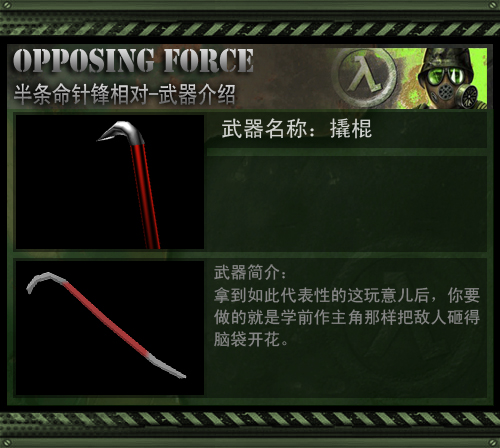 《半條命》代表武器。在黑山基地隨處可見(jiàn)的工具,在黑山基地武裝人員和后來(lái)的人類(lèi)反抗軍手中就成為了利器,當(dāng)一個(gè)拿著撬棍的敵人出現(xiàn)在你面前時(shí)他給你帶來(lái)的威脅僅次于管道鉗、霰彈槍和輕機(jī)槍。(僅在多人游戲出現(xiàn))