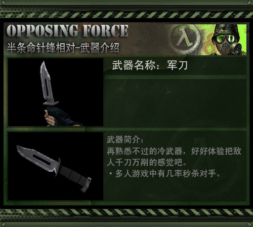 軍隊(duì)制式武器,小巧,威力中等,揮刀速度快,相當(dāng)于撬棍敲兩下,很有挑戰(zhàn)性的武器。在多人游戲中有背刺秒殺的效果。全游戲攻速最快的肉搏武器,缺點(diǎn)是攻擊范圍太短了。