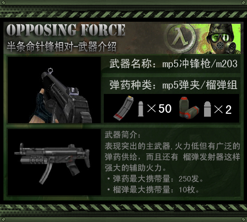 軍用武器,威力中等,擁有很不錯(cuò)的載彈量(50發(fā)),可以拾起十枚自推式榴彈,右鍵發(fā)射,游戲中初期的主力。在Won版游戲中這把武器是根據(jù)MP5SD5改編的,在steam版本改為M16A2下掛榴彈發(fā)射器。