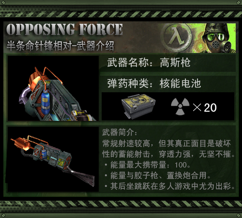 使用貧鈾作為彈藥,是黑山研究院實(shí)驗(yàn)型槍械,以射速出眾為特點(diǎn),并且具有強(qiáng)大的威力和巨大的后座力,按右鍵可以進(jìn)行能量聚集發(fā)射,其后坐力在多人游戲中可以讓玩家飛到半空,聚集時(shí)間過(guò)長(zhǎng)會(huì)傷到玩家自己。而且還可以隔墻傷害敵人,隔墻后傷害翻倍。正因如此在半條命原版的對(duì)戰(zhàn)中的高手因常常依賴(lài)高斯被新手扣上"作弊"的帽子。是一把虛構(gòu)武器。(僅在多人游戲出現(xiàn))