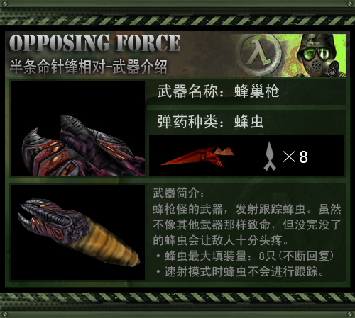 異形衛(wèi)兵裝備的武器,能發(fā)射8發(fā)蜂巢彈,優(yōu)點(diǎn)是無(wú)限備彈。左鍵追蹤,右鍵高速平射。不過(guò)只能在研究所中找到。(僅在多人游戲出現(xiàn))