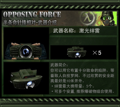 定點(diǎn)式炸彈,安裝后會(huì)發(fā)射激光,觸碰激光引爆。還可放置在墻上當(dāng)成簡(jiǎn)易樓梯(會(huì)把自己炸死),速通中常用的技巧,為你節(jié)省大量時(shí)間,全游戲最稀有武器,和火箭筒一樣,玩通關(guān)最多看見(jiàn)2-3個(gè)。