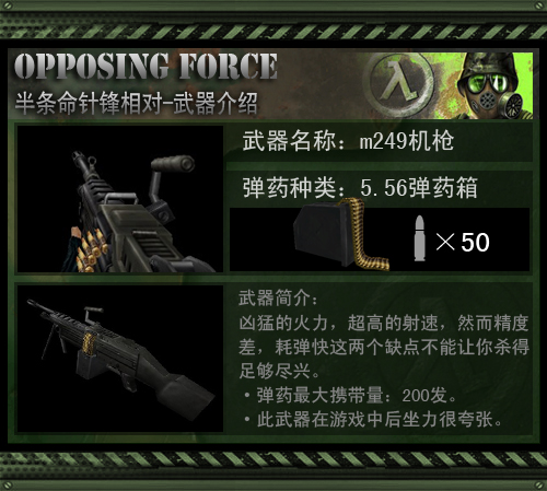 由比利時(shí)的FN武器公司研制的班用機(jī)槍?zhuān)@人,后坐力較大并較難控制,游戲中后期對(duì)付難纏的敵人,對(duì)付坑道蠕蟲(chóng)會(huì)有極佳的效果??梢岳么宋淦鞯目鋸埡笞M(jìn)行鋪助跳躍,現(xiàn)實(shí)中M249標(biāo)準(zhǔn)載彈量為100發(fā),游戲中將它減少了一半可能是為了游戲的平衡。