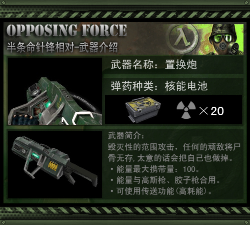 黑山給予其研發(fā)型號(hào)為XV11382,軍方和黑山研究院合作研制的實(shí)驗(yàn)性槍械,左鍵發(fā)出傳送球,傳送球完全擊中敵人可以將敵人傳送(多人對(duì)戰(zhàn)中玩家可以將其視為弱點(diǎn),因?yàn)楸恢苯訐糁胁粫?huì)受到傷害,而是讓你以較高的幾率離開(kāi)戰(zhàn)場(chǎng),給予你喘息的機(jī)會(huì)。當(dāng)然你得有強(qiáng)悍的身法并對(duì)其有充足的信心。而且如果你在持有敵方旗幟的情況下使用自我傳送的話(huà)旗幟會(huì)被丟棄,被直接擊中的傳送也一樣。),并且會(huì)散出光波攻擊范圍內(nèi)的敵人。右鍵將自己傳送(在多人模式中使用時(shí)非固定地點(diǎn),慎用),耗電極大(60個(gè)單位電能),但在不同地點(diǎn)會(huì)有很多不同的效果(主要是去獲得補(bǔ)給)。