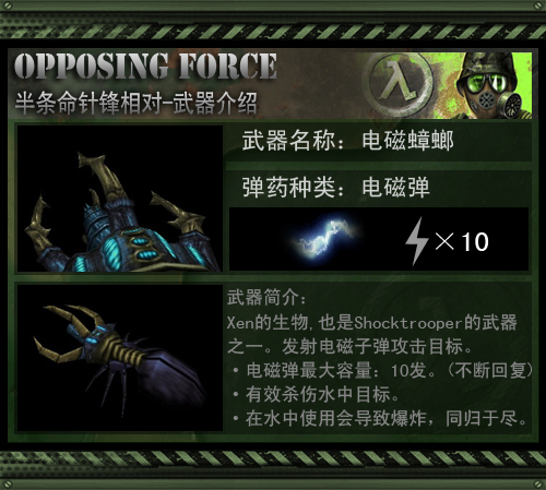 特殊生物武器,從異形戰(zhàn)士身上掉落,左鍵發(fā)出電光,無(wú)限備彈,此槍掉落后還會(huì)撲咬敵人,(掉落后有生命時(shí)間,結(jié)束后死亡然后消失。)當(dāng)你沒(méi)這把武器時(shí)它跳到你身上他就會(huì)成為你的武器。注意請(qǐng)勿在水中使用,由于電的特性,在水中使用會(huì)立刻殺死在水中的一切目標(biāo)包括使用者(在多人游戲中可以作為與敵人同歸于盡的戰(zhàn)術(shù)。)