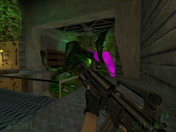 從醫(yī)務(wù)室(infirmary)出來(lái),穿過(guò)一條空無(wú)一人的走廊,推開(kāi)走廊的大門(mén)向左拐,在最里面的一個(gè)大廳里,發(fā)現(xiàn)兩名醫(yī)務(wù)人員正在那兒觀察蜘蛛怪對(duì)我同伴的尸體起作用的過(guò)程。在角落的方桌上,放著我們來(lái)時(shí)穿的作戰(zhàn)外套。我走過(guò)去,毫不猶豫的穿上外套,然后離開(kāi)大廳,沿著大門(mén)對(duì)面的走廊通道向前。在另外一間大廳的右側(cè),一個(gè)變異的生物正在發(fā)瘋地撕咬研究人員的尸體,看見(jiàn)我之后,它從破碎的窗口跳將出來(lái)。由于我手無(wú)寸鐵,我決定三十六計(jì),走為上計(jì)。一陣小跑,我來(lái)到了大廳的另一端。這兒破爛不堪的大門(mén)標(biāo)著安全出口(security clearance)幾個(gè)字樣。我順著門(mén)后的樓梯來(lái)到地下室中,找到警衛(wèi)人員,幾句對(duì)話(huà)之后,他打開(kāi)了安全門(mén)。在他的祝福聲中,我走進(jìn)了一間激光束四射的房間,在其走廊上發(fā)現(xiàn)了一把管道鉗。小心的繞過(guò)電線(xiàn),拾起管道鉗,匍匐通過(guò)兩道激光束后,我來(lái)到了激光反射鏡前,用剛到手的管道鉗打碎激光反射鏡,所有的電源消失。繼續(xù)沿著樓梯向前走,走廊的天花板突然碎裂,兩只蜘蛛怪從天而降,用管道鉗解決他們之后,我走到一間毒液橫流的小房間前,在幾個(gè)機(jī)械裝置的后面遭遇蜘蛛怪的攻擊。不過(guò),戰(zhàn)斗很快就結(jié)束了。在路過(guò)一個(gè)樓梯口時(shí),我找到了一些補(bǔ)給品。出了過(guò)道,我的眼前一亮,原來(lái)不知不覺(jué)之間,我已經(jīng)走出了建筑物,到達(dá)一個(gè)峭壁四立的峽谷之間。