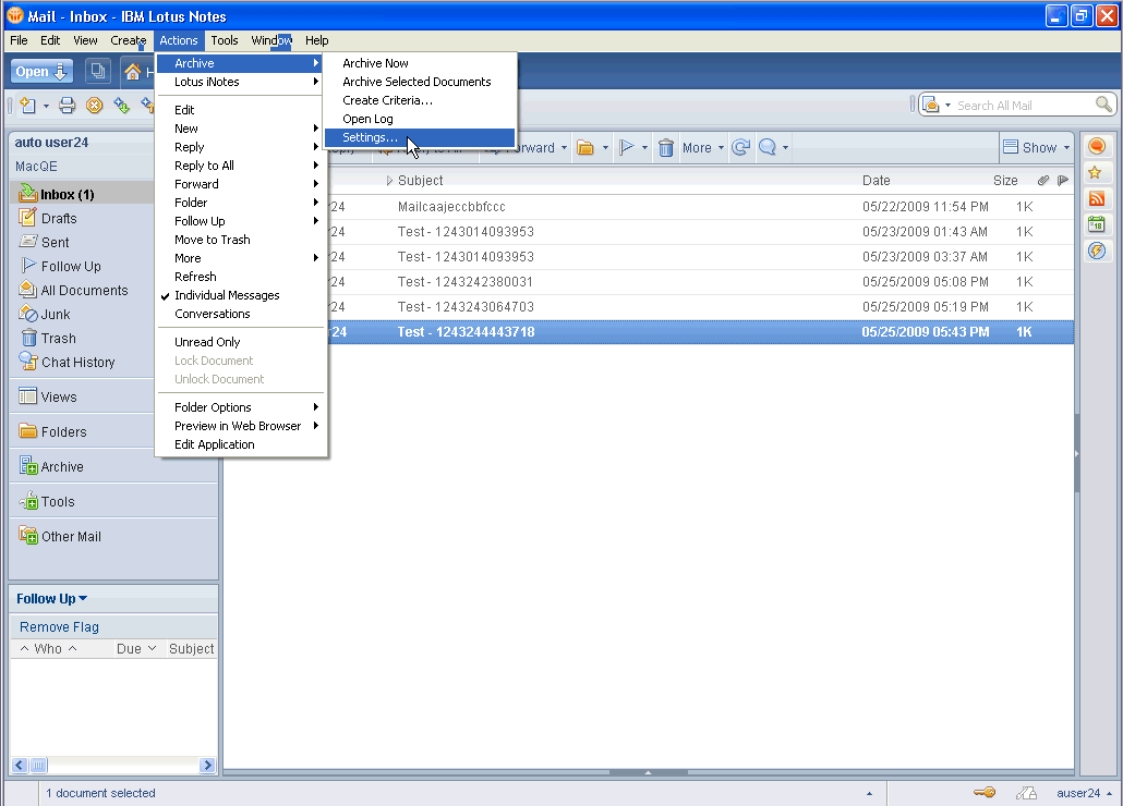 當(dāng)郵件容量超過指定的郵件服務(wù)器的容量時(shí),會(huì)受到警告信息。選擇 Archive-Settings 可以設(shè)置郵件備份的規(guī)則,把郵箱里的部分郵件轉(zhuǎn)移到本地的另一個(gè)指定文件夾(如 圖 4)。當(dāng)您需要做郵件備份的時(shí)候,就可以選定一條規(guī)則進(jìn)行備份。您也可以在 Archive-Settings 里設(shè)置 schedule 來定時(shí)啟動(dòng)備份操作。對(duì)于備份好的郵件,可以在視圖 Archive 下面方便的找到您備份的這部分郵件。