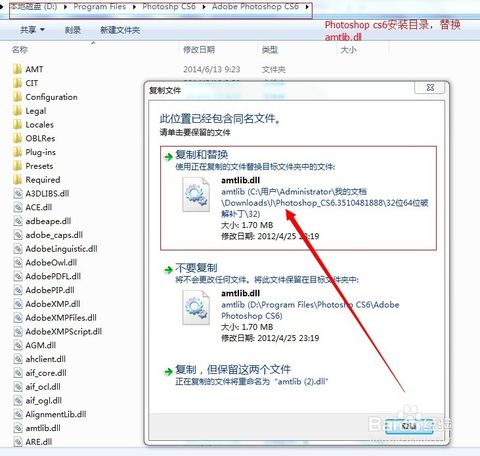 復(fù)制目錄里面的文件“amtlib.dll”,然后進入Photoshop CS6的安裝目錄,并進入Adobe Photoshop CS6這一層,將剛剛復(fù)制的文件黏貼在這里,選擇覆蓋。