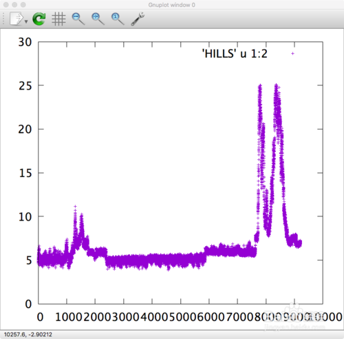 4、此外,gnuplot還可以直接讀取文件中的數(shù)據(jù)。例如,下圖中Hills文件。從命令行進入到HILLS所在文件夾,啟動gnuplot,然后輸入命令:plot 'HILLS' u 1:2就可以得到以HILLS文件第一行作為X,第二行作為Y的圖像。