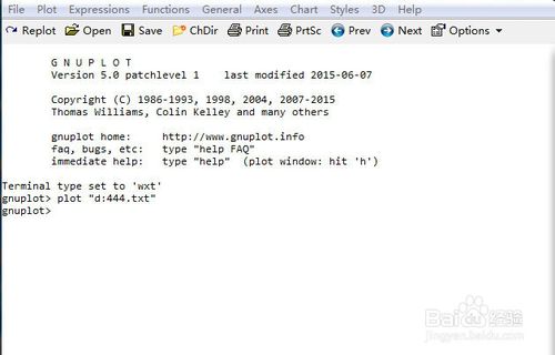 3、打開gnuplot程序,輸入指令:plot "d:444.txt"其余的都默認系統(tǒng)設(shè)置,按回車鍵。