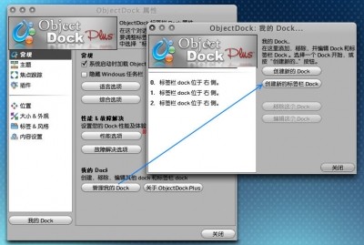 1.運行objectdock 他默認(rèn)的是一個dock 和一個標(biāo)簽欄dock。這里我用不到標(biāo)簽欄dock,所以打開設(shè)置,選擇我的 dock,選定標(biāo)簽欄 點擊移除這個dock,點擊確定,2.之后剩下的就只是一個dock {然后點擊創(chuàng)建新的dock(我用了7個,具體的:我的電腦、ie、回收站、qq、千千靜聽、軟件、游戲)
