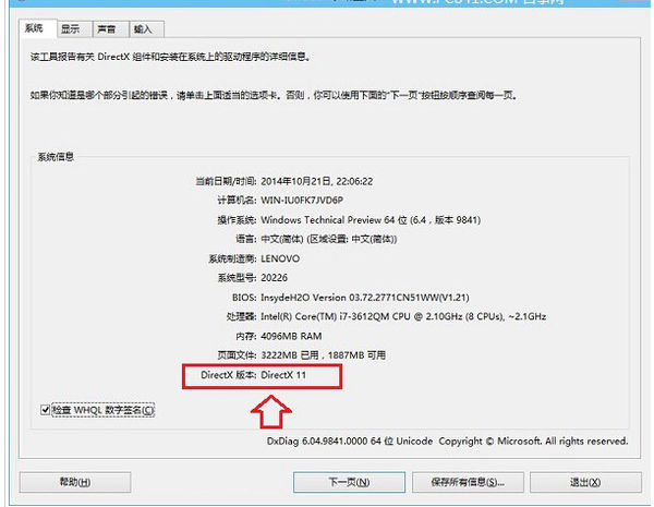 3、之后就可以打開dxdiag診斷工具界面了,在默認的【系統(tǒng)】選項卡下的最底部,就可以看到Directx版本了,如下圖所示: