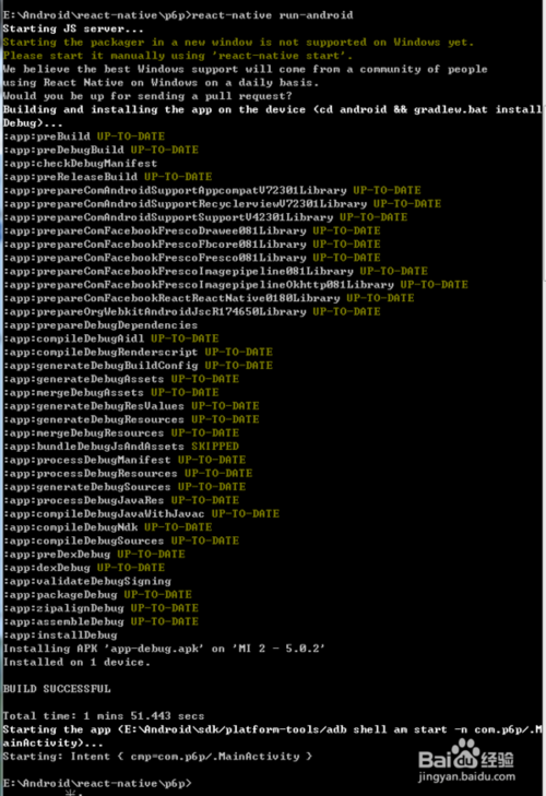 手機通過USB連接電腦,切換成調(diào)試模式后。在cmd中輸入:adb devices,可查看設備是否接入成功。安卓系統(tǒng)版本大于5.0的直接執(zhí)行:adb reverse tcp:8081 tcp:8081,實現(xiàn)端口代理配置?!拘∮?.0參考】cd至剛才初始化成功的項目目錄下,執(zhí)行:react-native run-android,初次執(zhí)行react-native需要下載一些文件等,編譯完成后會自動一個以你的項目命名的APP至你的手機上。