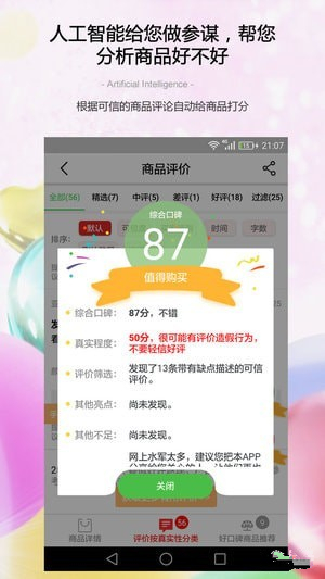 【分析商品值不值得買】用人工智能算法分析商品的口碑好不好,給商品的口碑打分,為您提供購物參考建議。