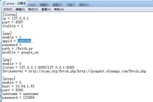 7、下載文件解壓后,使用文本編輯器打開 goagent/local/proxy.ini,修改第8行的 appid = 為剛申請的應(yīng)用名