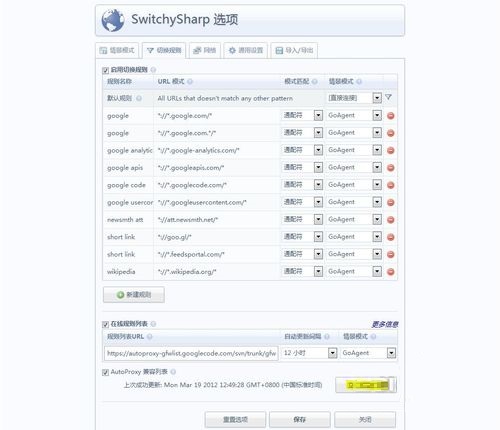 13、在 SwitchSharp 選項中,選擇切換規(guī)則選項卡,點擊立即更新列表來獲得最新的自動翻墻規(guī)則列表