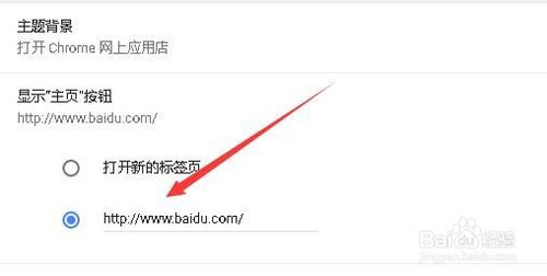 4、這時下面的各項即可選擇了,我們選擇下面的一項,然后輸入主頁的網(wǎng)址。這樣以后再點擊chrome瀏覽器工具欄上的主頁按鈕,就可以快速打開剛剛設(shè)置的主頁了。