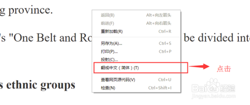 2、用鼠標(biāo)右鍵點擊網(wǎng)頁,在彈出的對話框里面選擇“翻譯成中文(簡體)”,如下圖所示。