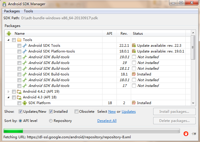 其次,將下載好的adt和ndk解壓在指定目錄就行,運行adt里面的sdk目錄下的eclipse,在菜單欄中點擊windows,點擊AndroidSDKManager在線更新sdk,有更新的話盡量全選,這個更新的過程會話費較多的時間,沒辦法,那就等吧!直至sdk更新完成(后面的在xcode下配置環(huán)境同樣需要經(jīng)過這一步)