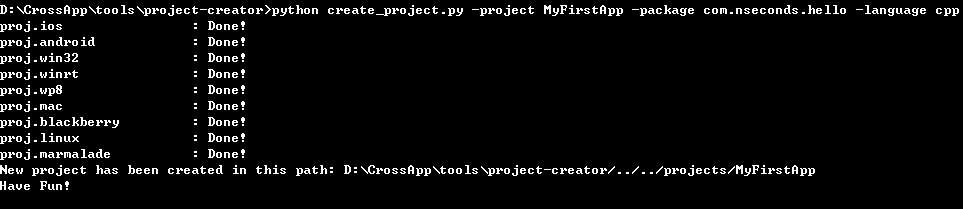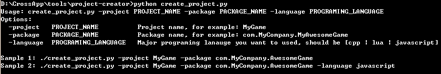 創(chuàng)建工程使用的就是這個.py文件,打開dos,通過cd命令,將當(dāng)前目錄定位到CrossApp\tools\project-creator,運行pythoncreate_project.py就可以看見新建工程的示例說明,這里我們新建一個名為MyFirstApp的工程