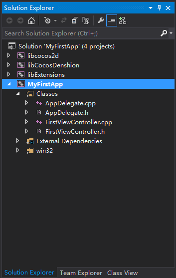 雙擊運行MyFirstApp.sln,進入vs工程界面,vs界面右面的解決方案資源管理器就是我們新建的工程的代碼結(jié)構(gòu),展開MyFirstApp下的Classes目錄,可以看見工程已經(jīng)默認為我們創(chuàng)建好了兩個類,其中AppDelegate就是我們工程的入口類,我們只需要在Classes下面添加代碼就可以開始編寫我們自己的App了。