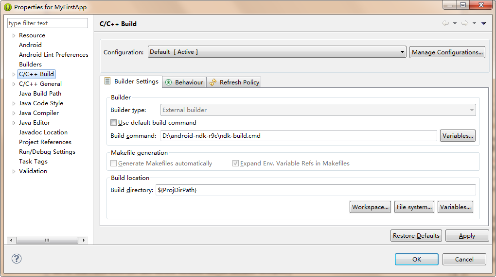 然后需要為工程配置ndk編譯環(huán)境,在菜單欄選擇Project,點擊properties,在打開面板中點擊C/C++Build,在Buildcommand一項中,把默認的command替換為自己nkd目錄下的nkd-build.cmd,例如:D:\android-ndk-r9c\ndk-build.cmd。