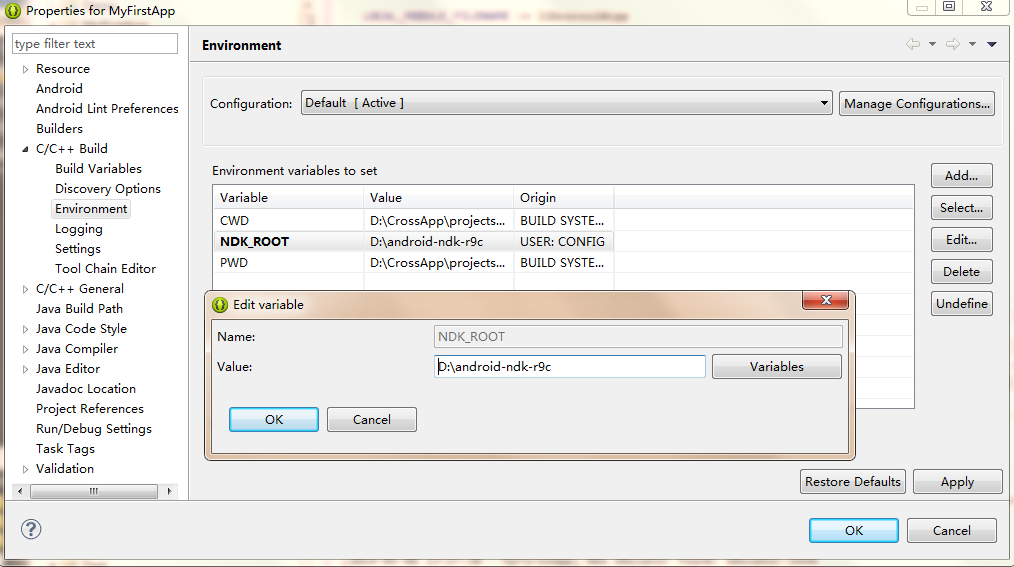 至此windows開發(fā)環(huán)境搭建完成。對于第一種,打開build_native.sh文件找到#paths這行,在下面添加NDK_ROOT=”D:/android-ndk-r9c”這句話就可以了。如果是第二種添加方式,在properties頁面展開C/C++Build,在Environment新建一個名為NDK_ROOT的變量,值為NDK的解壓目錄。