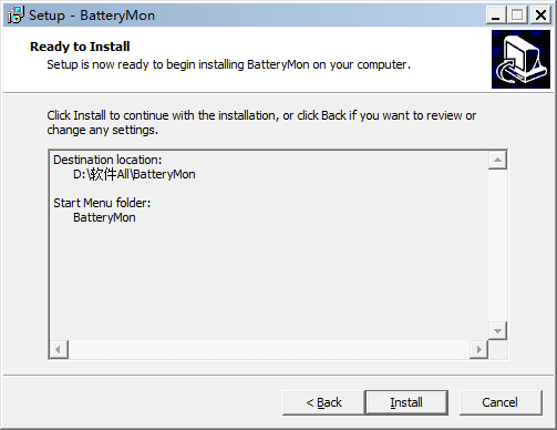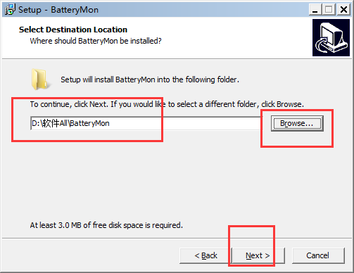 2.接下來你將看到如下界面:該處需要你選擇時(shí)候設(shè)置BatteryMon電池修復(fù)工具的安裝目錄(小編建議該處用戶最好不要選擇C盤哦,以免拖慢系統(tǒng)運(yùn)行速度)