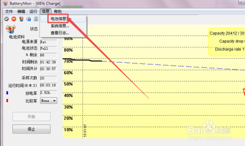 然后可以根據(jù)需要點(diǎn)擊上面的 信息 菜單,在出現(xiàn)的菜單中點(diǎn)擊 電池信息 選項(xiàng);然后在打開的頁面中就可以看到制造商、序列號、設(shè)備名等信息,而右側(cè)綠色的部分表示剩余的電量。