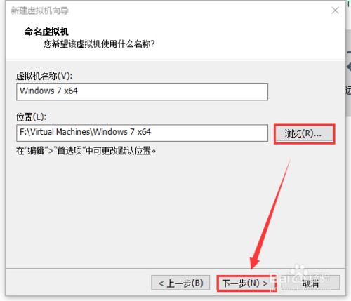 “虛擬機(jī)名稱”根據(jù)自己喜好填寫,點(diǎn)擊“瀏覽”,選擇虛擬機(jī)安裝的位置,建議安裝到C盤以外的磁盤,然后點(diǎn)擊“下一步”