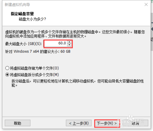 磁盤大小默認(rèn)60G,可以根據(jù)自己電腦硬盤空間大小調(diào)整,點(diǎn)擊“下一步”