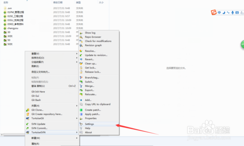1.首先在你SVN項(xiàng)目所在文件夾右鍵,找到TortoiseSVN,然后選擇里面的“Setting”,如圖所示。