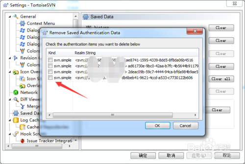 4.這是會彈出一個(gè)對話框,里面是你以前保存的SVN地址,那么找到你想修改用戶名密碼的SVN地址,選中之后點(diǎn)擊ok,如圖所示。