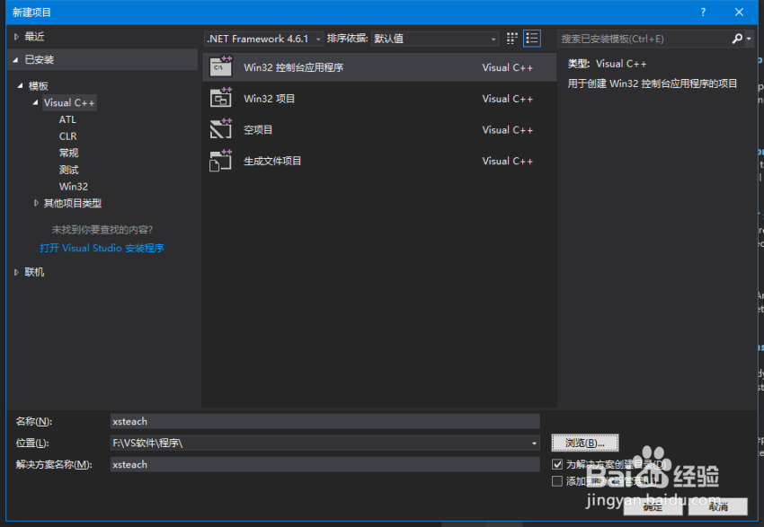 進(jìn)入新建項(xiàng)目后,選擇已安裝-模塊-中間選擇win32 控制臺(tái)應(yīng)用程序-把下面的路徑改好,使用的名稱,文件存儲(chǔ)路徑。自行設(shè)置,最好是方便記憶的。
