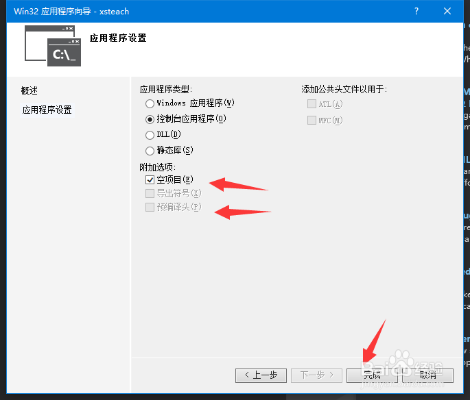 下面這里注意修改附加項(xiàng)目,選擇空項(xiàng)目,預(yù)編譯頭不要勾選。點(diǎn)擊完成!