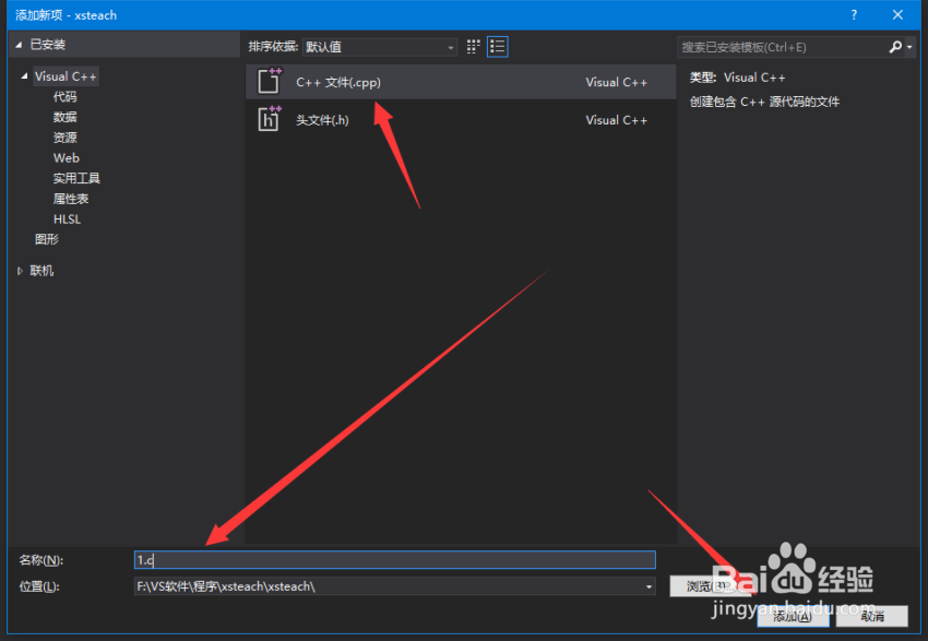 默認(rèn)選擇C++,由于Visual Studio2019正式版沒(méi)有C語(yǔ)言板塊,默認(rèn)和C++結(jié)合了!選擇C++文件后,在下面把文件名修改成 .c 后綴的文件嗎,看箭頭,在按確定。