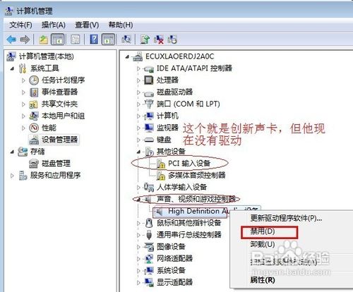 3、在打開里面的“設備管理器”,點擊里面的“聲音、視頻和游戲控制器”。圖中的禁成聲卡為“Realtek High Definition Audio” (注意:每臺電腦可能有所不懂,禁用的時候都可能都不一樣。)點擊右鍵停用聲卡,然后重新啟動下電腦。