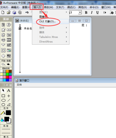 在Authorwar的菜單欄中找到插入菜單,然后點(diǎn)OLE對(duì)象;