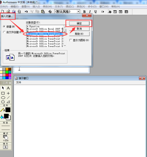 在插入對(duì)象中選取Powerpoint,然后點(diǎn)確定;