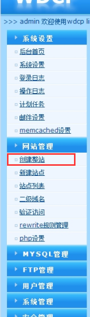 進入控制面板以后,我們可以在左面看到一個菜單欄目,配置好我們的環(huán)境以后,下面我們直接點“網站管理--創(chuàng)建整站”