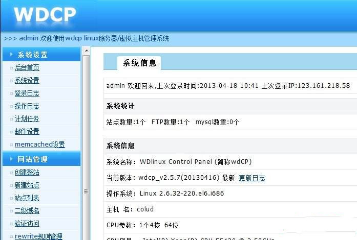 在登陸頁面輸入驗證碼后點擊登陸,就進入到了wdcp控制面板的控制頁面了。
