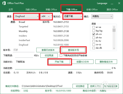 1、雙擊Office Tool Plus.exe工具。在打開的頁面中選擇下載office。通道選擇Dogfood,版本選擇x64,下載方式一般是選擇迅雷下載,如果出錯(cuò)的話就使用aria2下載。然后點(diǎn)擊查詢版本號,最后再點(diǎn)擊開始下載。