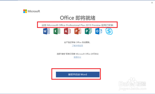 6、點(diǎn)擊接受并啟動(dòng),然后就會進(jìn)入到word界面,我們打開一個(gè)word文檔。點(diǎn)擊左上角的文件,然后點(diǎn)擊賬戶,就能看到office的版本以及激活信息了。office2019是自動(dòng)激活的。