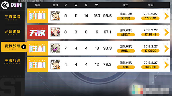 我們切換生涯數(shù)據(jù)選項(xiàng)卡至競技戰(zhàn)績,便可以看到我們最近的每場比賽的詳細(xì)信息。顯示了我們是失敗還是勝利與我們每場比賽的具體數(shù)據(jù)情況,特別清楚,方便玩家在日后進(jìn)行戰(zhàn)后回盤分析。