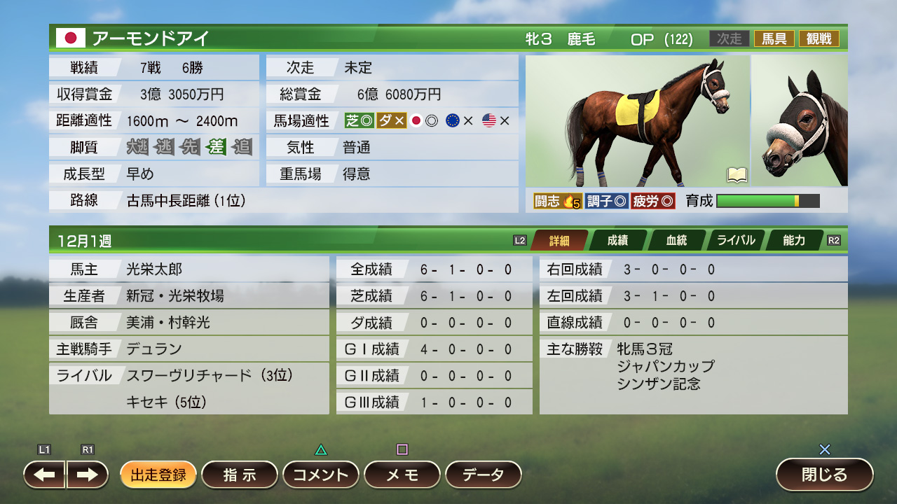 以用強(qiáng)母馬制勝全世界的比賽為目標(biāo),作為業(yè)主的領(lǐng)導(dǎo)人正在鉆研中。充滿自信,好勝的性格。