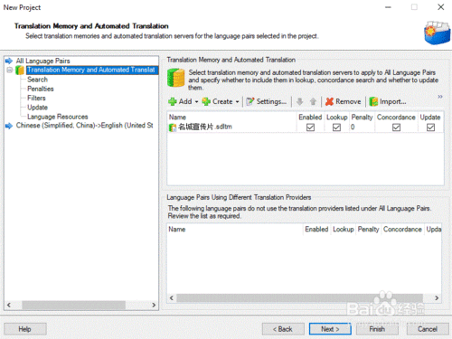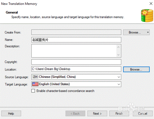 編輯記憶庫(kù)的相關(guān)信息:名稱(chēng)、保存位置、源語(yǔ)言、目標(biāo)語(yǔ)言等,設(shè)定好后,點(diǎn)擊“下一步(Next)”。