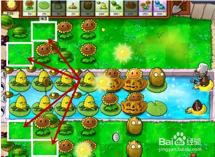 無(wú)盡模式的布局是非常關(guān)鍵的,一開(kāi)始陸地必須要放4個(gè)西瓜,每行兩個(gè)向日葵,水路后4排放玉米投手,緊接著放兩排向日葵,南瓜罩罩住水面的向日葵,因?yàn)樗讜?huì)冒出僵尸,太陽(yáng)花前面可以放小堅(jiān)果墻保護(hù),這關(guān)以攢陽(yáng)光為主。陸地上僵尸一共能走4個(gè)格子,所以事先在第四個(gè)格子埋好土豆,倭瓜留著危急時(shí)刻用。必須留出如圖所示的空格,這些空格是后面用來(lái)補(bǔ)充植物的,這很關(guān)鍵。